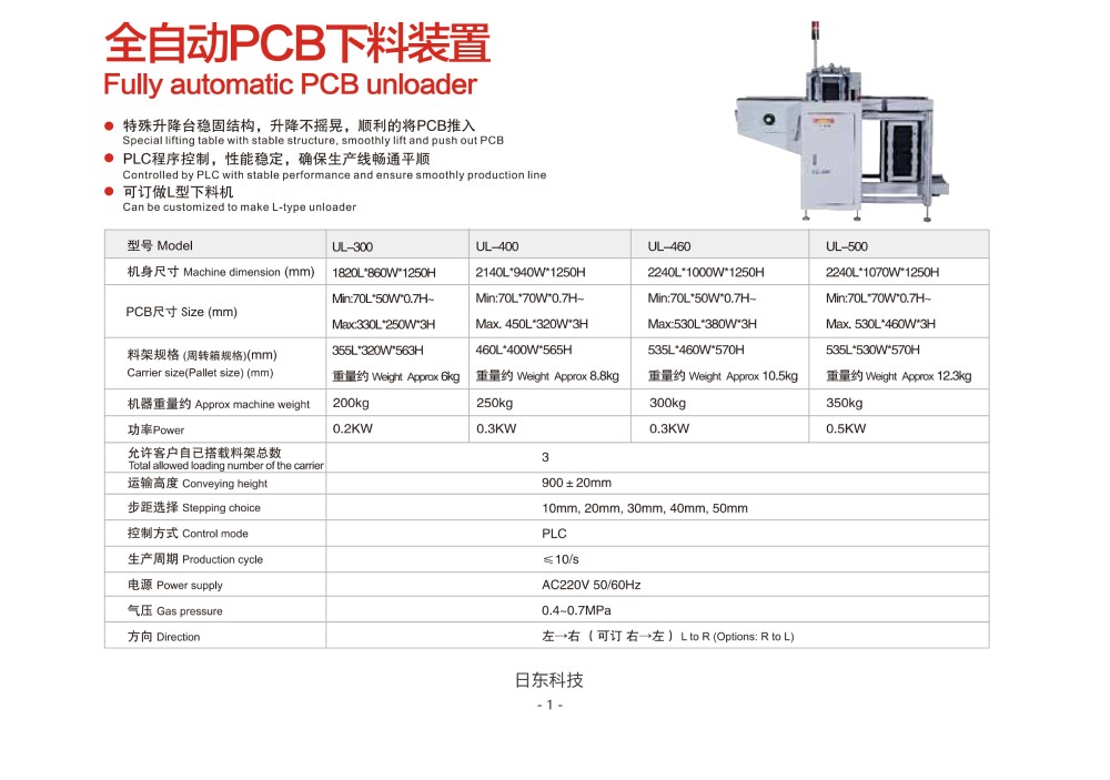 全自動(dòng)PCB下料機(jī)介紹:特殊升降臺(tái)穩(wěn)固結(jié)構(gòu),升降不搖晃,順利的獎(jiǎng)PCB推入。PLC程序控制,性能穩(wěn)定,確保生產(chǎn)線(xiàn)暢通平順。可訂做L型下料機(jī)。