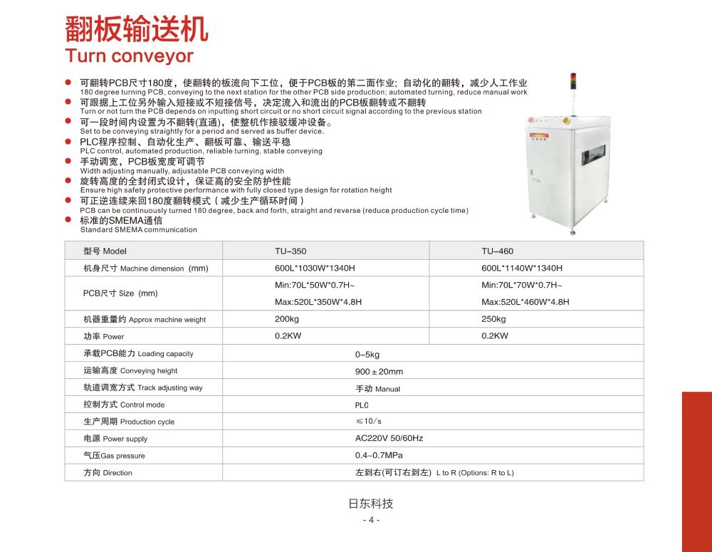 可翻轉PCB尺寸180度, 使翻轉的板流向下工位, 便于PCB板的第二面作業; 自動化的翻轉, 減少人工作業;