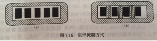 1、在兩焊盤之間無導線通過時,可采用阻焊掩膜窗孔形式,當兩焊盤間有導線通過時,則采用圖b形式,以防止橋連。