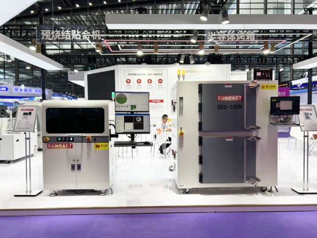 在本次展會上,日東科技展出了最新研發的半導體封裝設備,展示了在這一領域的持續創新與突破。自主研發的“IC貼合機”和“預燒結貼合機”可實現高精度芯片貼合,應對大批量wafer上料的貼裝產品及功率模塊、電源模塊、新能源、智能電網等產業領域。此外,新推出的“半導體烤箱”和“快速固化烤箱”則在半導體封裝制程中提供了可靠的烘烤、固化與粘接解決方案。這些設備的展出不僅體現了日東科技強大的研發實力,也為客戶帶來了更多高效、穩定的生產選擇。
