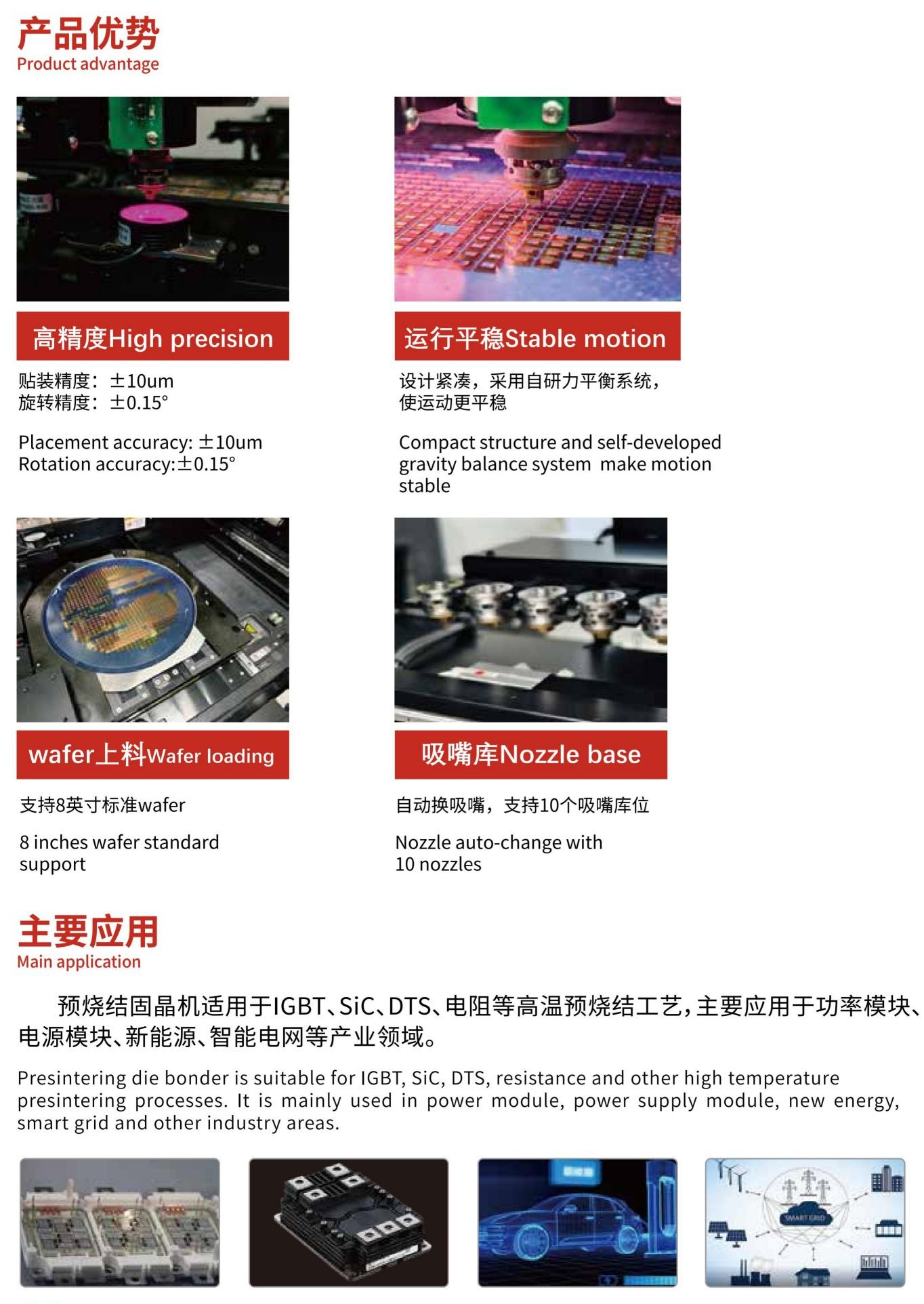 面向功率半導體芯片貼裝市場,配備功能更加強大的 BONDHEAD系統(tǒng),除了高精度貼合功能外,還具備保壓、 加熱功能。配合高精度的加熱系統(tǒng),實現(xiàn)電子元器件 的預(yù)燒結(jié)貼合。